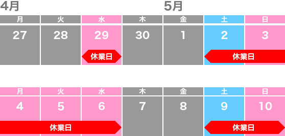2026年 4月29日(水)・5月2日(土)~5月6日(水) の期間、土・日・祝日は下記の通り休業日とさせていただきます。